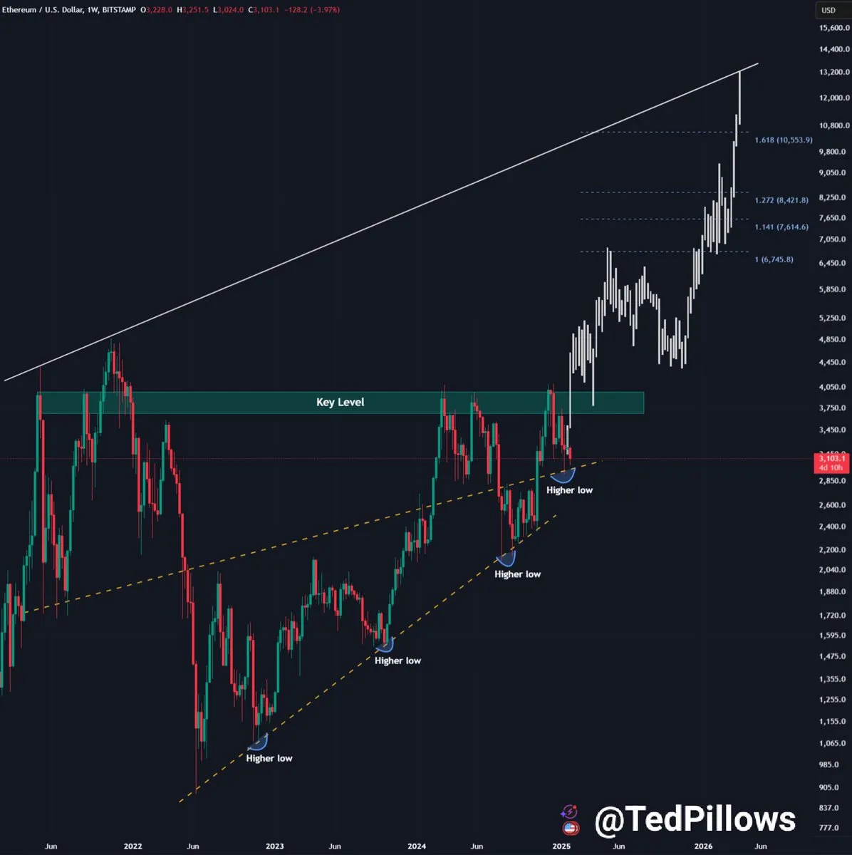 In an X post, Ted found out that the Ethereum price will hit $10,000 internally in three to four months. This came because the analyst referred to that ETH began forming higher lows inside the longer time-frame.