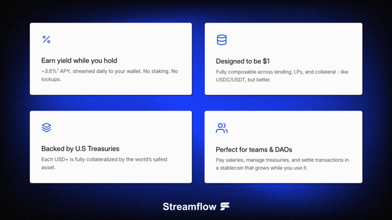 Streamflow announces USD+, a U.S. Treasury-backed stablecoin built on Solana that distributes daily yield directly to holders’ wallets. Designed for Web3 companies with treasuries and crypto-native investors managing idle capital, USD+ enables users to earn yield on stable balances without any staking or lockups.