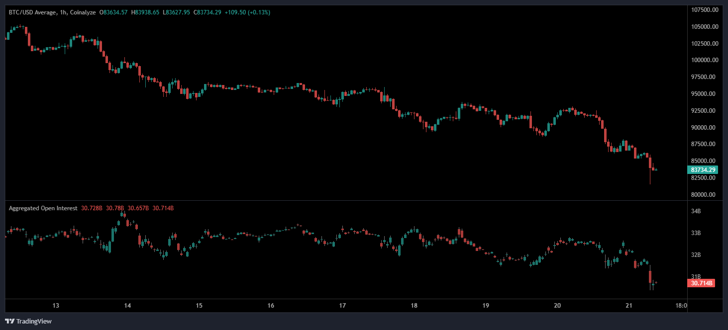 The lower panel illustrates aggregated open interest trending downward, a signal that traders are reducing exposure rather than building new directional positions. This contraction in open interest aligns with risk-off behavior, where both long and short participants unwind positions amid uncertainty.