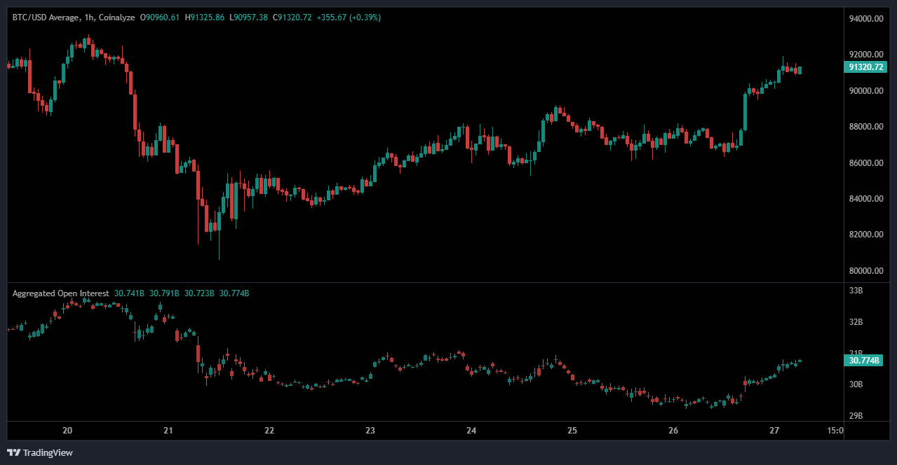At the time of writing, BTC trades around $91,382.64 with a daily gain of 0.96%, extending its recovery from the recent low at $80,522.72.