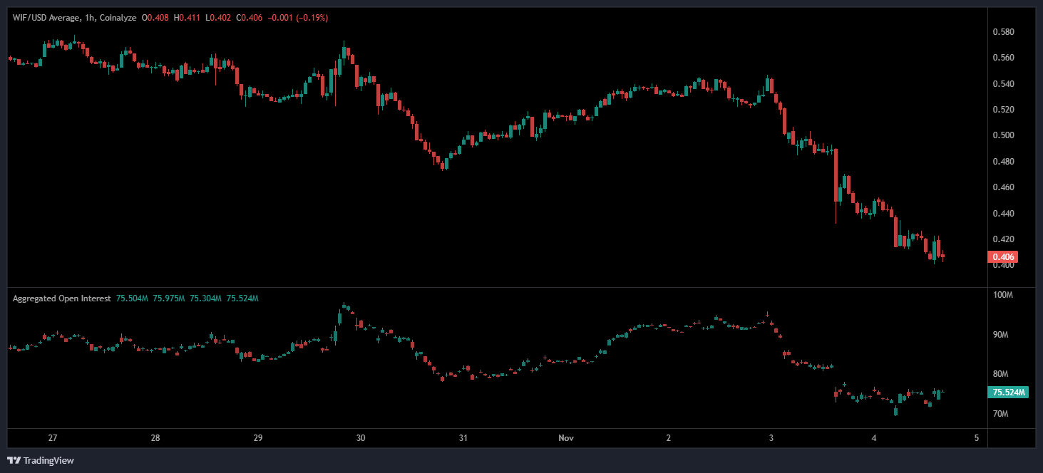 Dogwifhat price prediction 1-hour chart shows that there has been a gradual trend after a prolonged downward trend, and currently, WIF is trading around the levels of $0.406. Combined open interest in derivatives platforms stands at about $75.5million, which is a drastic decline compared to the previous week's levels.