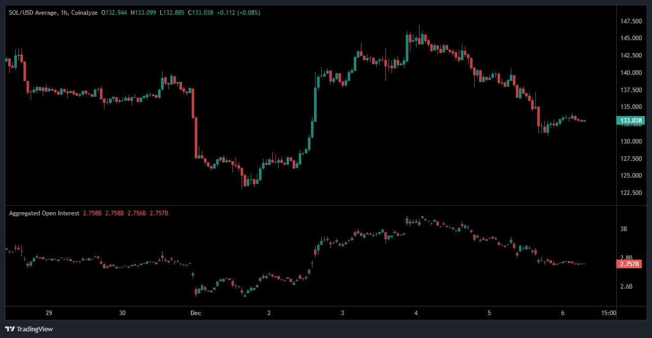 As prices advanced, open interest increased from around 2.68 billion to nearly 3.0 billion, indicating new long positions entering the market. Once the crypto reached the $145 region, the price gradually reversed toward $132–$135.